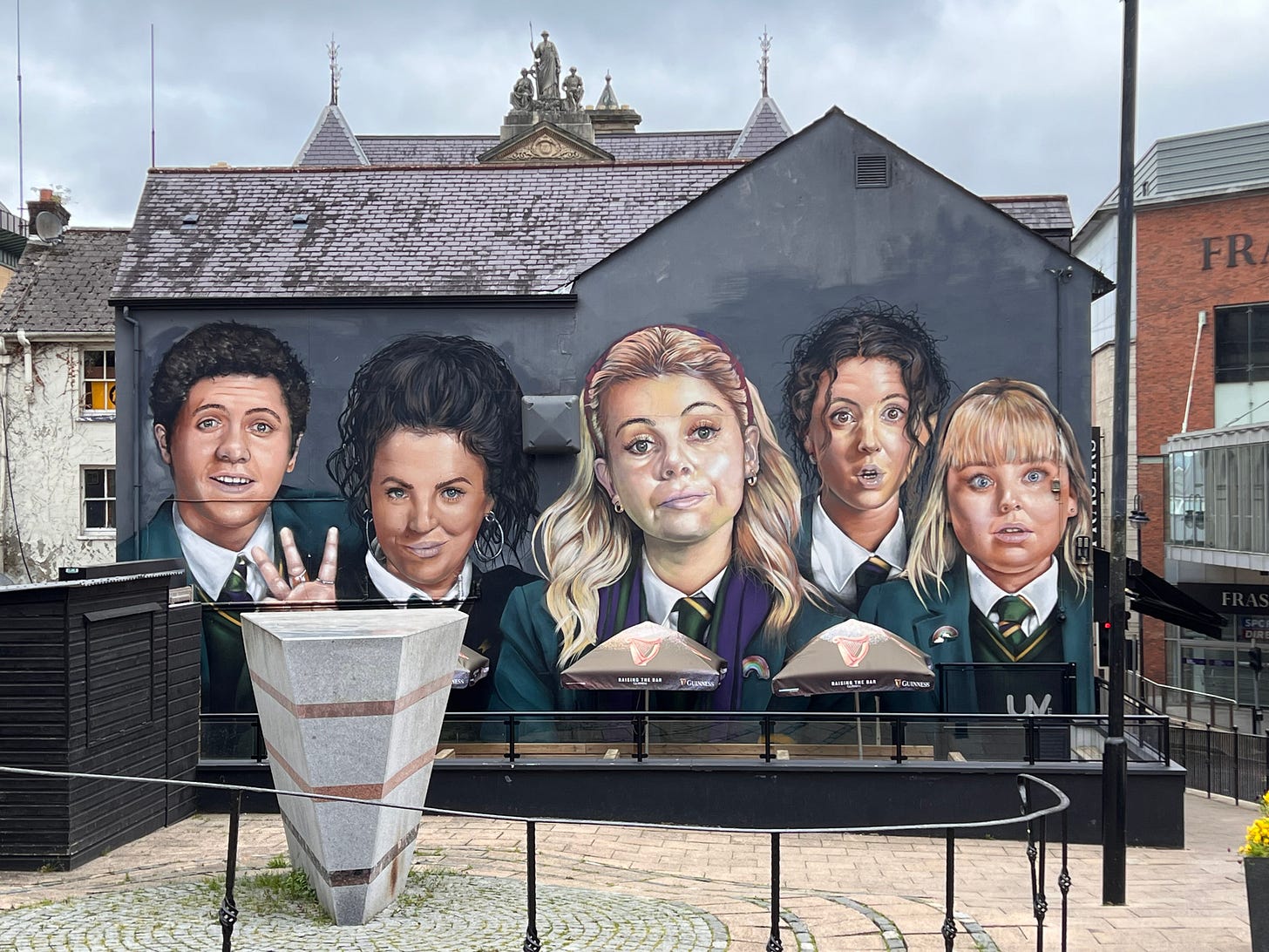 A few hours later, I emerged from the library and turned the corner to find the new Derry Girls mural. If you haven’t watched the show, it’s excellent—the writer and producer has woven the recent history of Derry into a funny and dynamic tale of five young kids just trying to get through each day when the IRA and British troops were facing off all around them.
