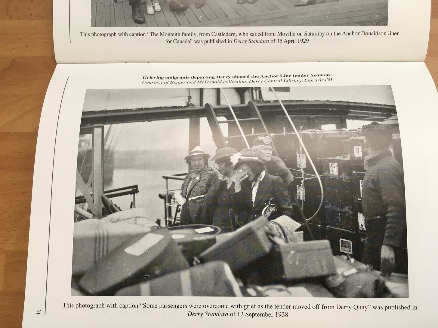 I contacted the librarians at Derry Central about a month before my trip, asking them what holdings they might have. They arranged to pull books and vertical file folders for me so that they were waiting when I arrived. Not all the materials directly related, such as the book with images above that showed immigrants leaving Derry in 1938, but background information like that does help to illustrate how important Derry was as a center of immigration for over two hundred years.